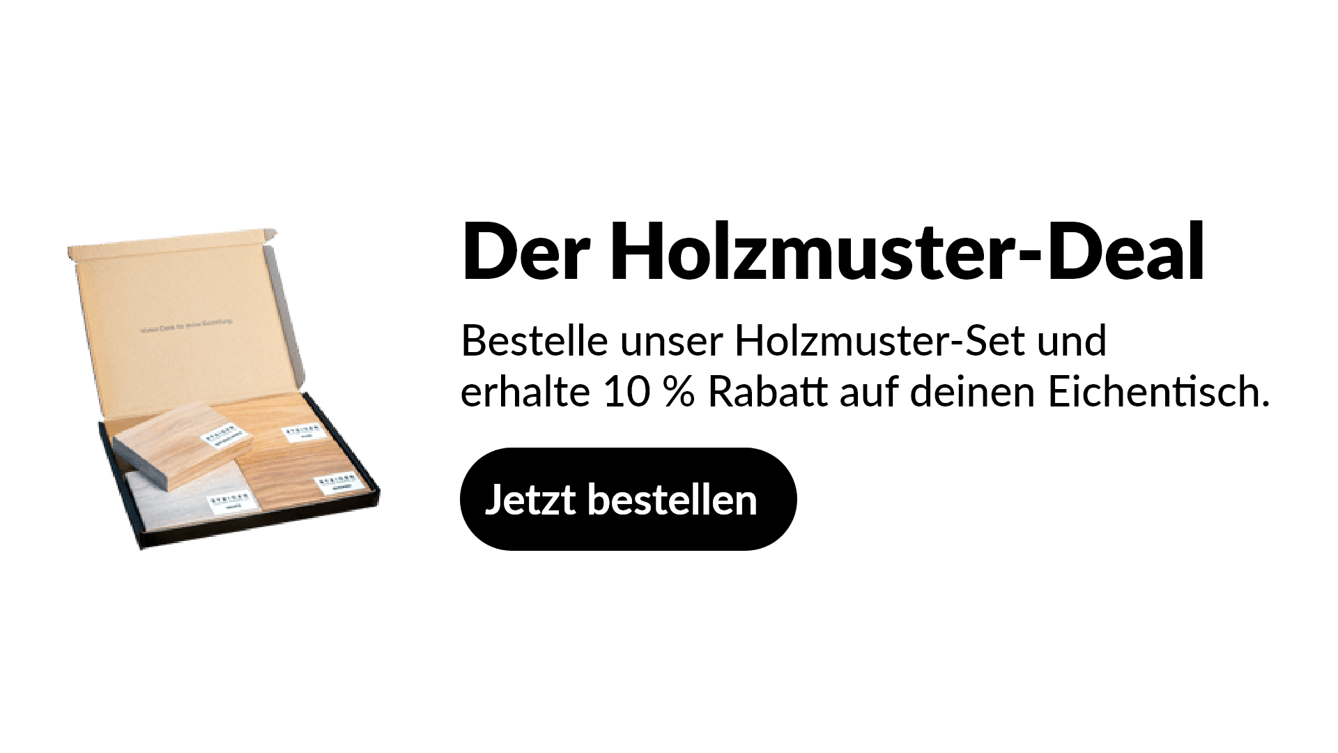 Zahle 10€ für unsere Holzmuster und du erhältst einen 10% Gutscheincode für deinen konfigurierten Traumtisch.