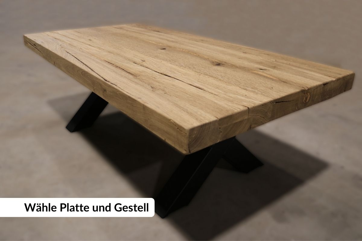 Dies ist kein normaler Tisch. Massives Alteichen-Holz sorgt dafür, dass jeder Tisch durch seine außergewöhnliche Maserung ein Unikat ist. Deswegen suchst du dir aus unserem aktuellen Lagerbestand genau deine Tischplatte aus. Die Platten haben eine Dicke von 40mm oder 60mm.