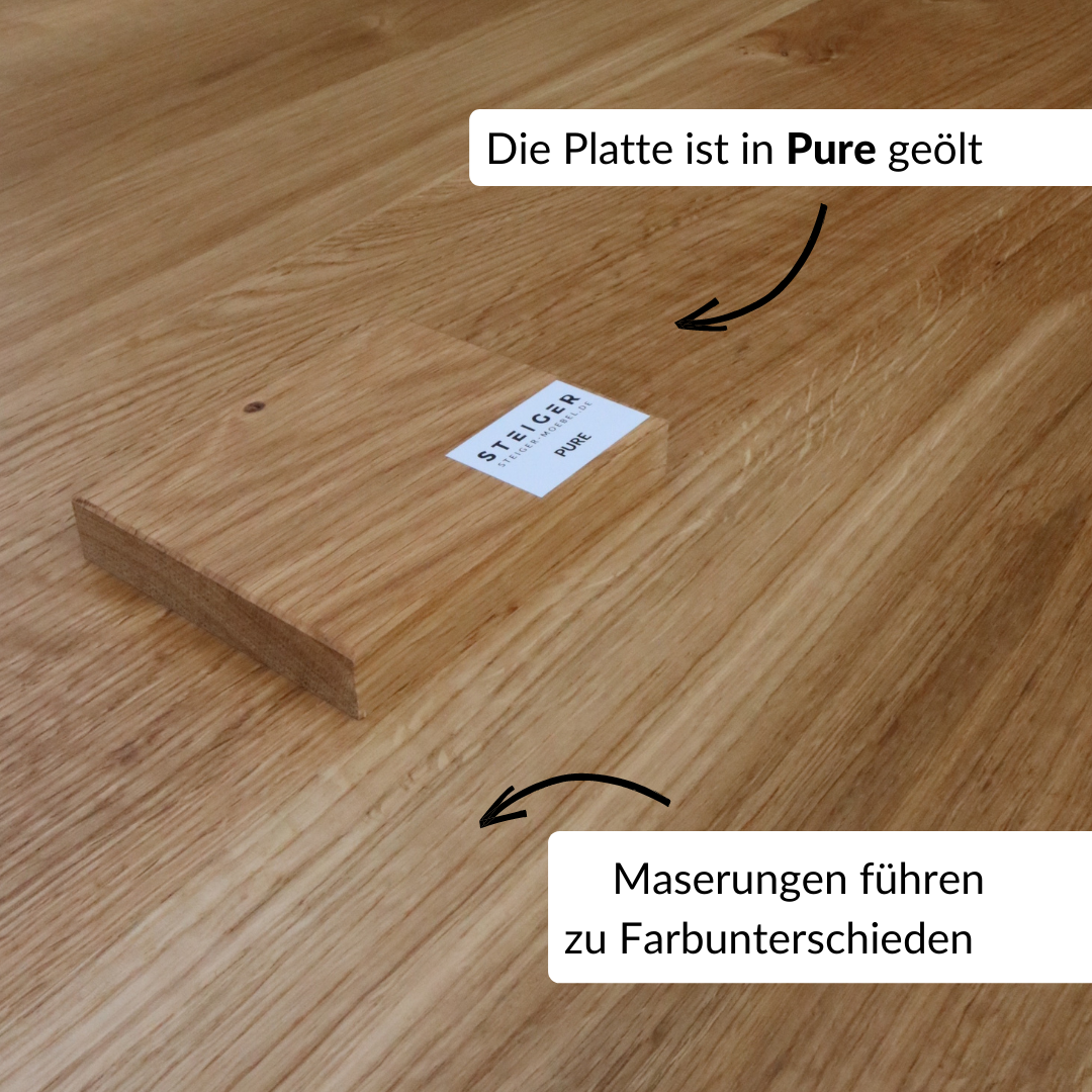Wichtig: Da Holz ein Naturprodukt ist, wird Öl unterschiedlich aufgenommen. Daher können wir nicht garantieren, dass dein Tisch genauso aussieht, wie das Holzmuster.