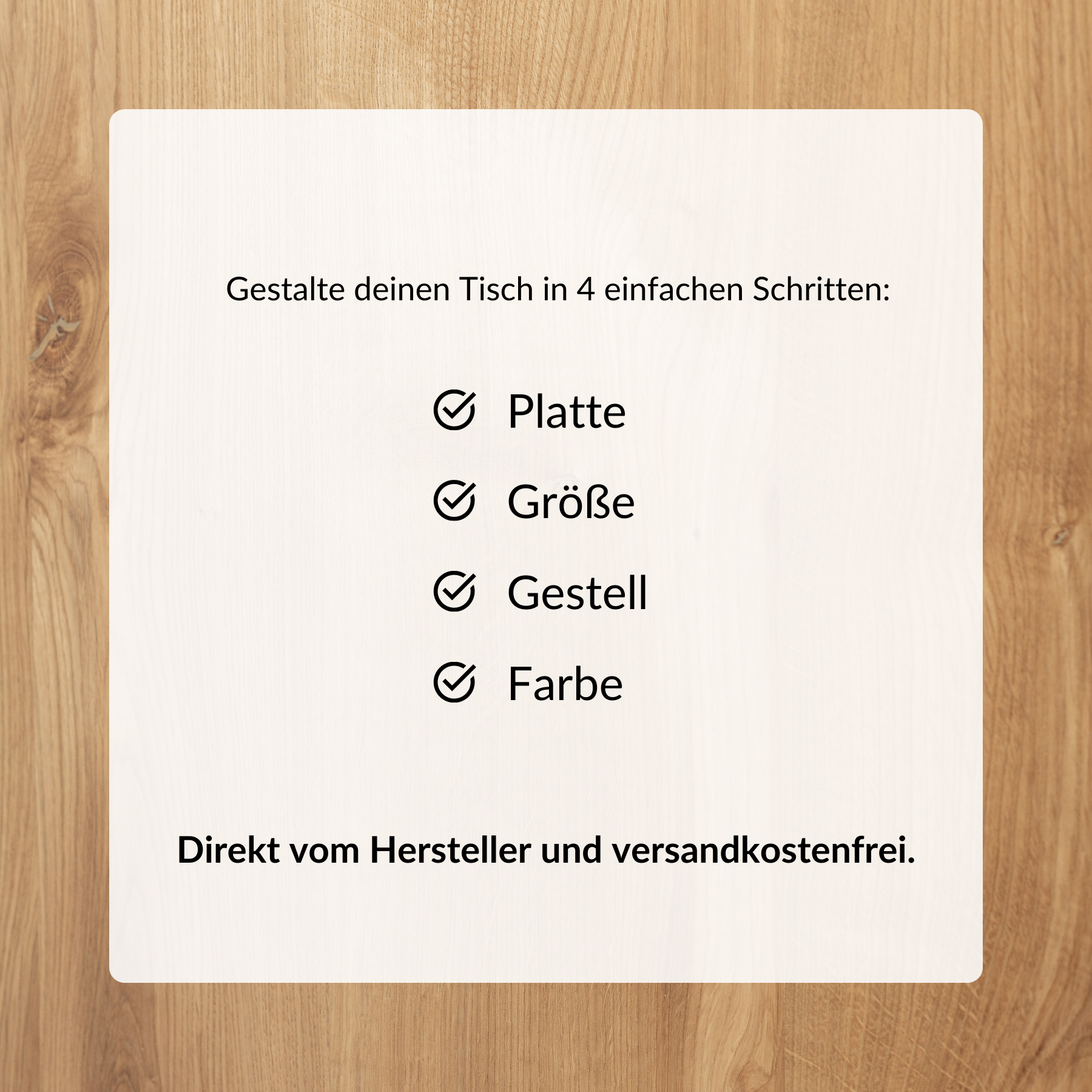 Dieser Tisch ist eine Beispiel-Konfiguration. Die Tischplatte besteht aus 40mm massivem Eichenholz mit Schweizer Kante. Die Größe liegt bei 260 x 120 cm und eignet sich dadurch perfekt für 6-8 Personen. Das Gestell besteht aus hochwertigem Stahl und wurde pulverbeschichtet. Wenn dies dein Traumtisch ist, dann kannst du ihn zum Warenkorb hinzufügen und sofort kaufen. Wenn du etwas anpassen möchtest, dann kannst du im Konfigurator nach Belieben sowohl die Kante, als auch Größe, Farbe und Gestell ändern.