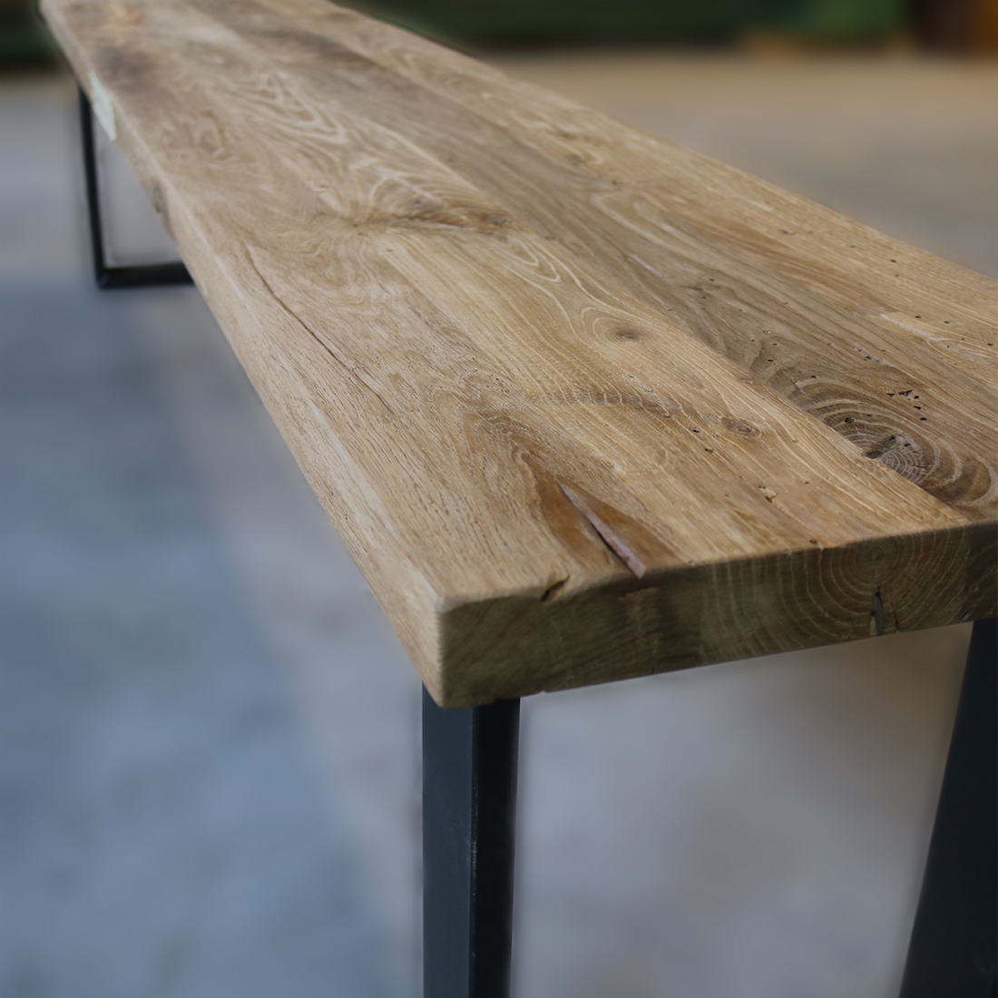 Alteiche wird mit der Zeit immer attraktiver und ist nicht nur nachhaltig, sondern auch überaus ausdrucksstark. Ein Esszimmer mit Tisch und Bank aus Eiche massiv hat also eine ganz besondere Ausstrahlung und zeugt von Stabilität und Langlebigkeit. Immerhin sind die verwendeten Eichenbohlen mindestens 100 Jahre alt und gehörten meist zum Balkengerüst abgerissener Bauten mit Massivholzbalken. Eventuell vorhandene Risse und Astlöcher sind also keine Makel, sondern lebendige Zeichen der Zeit. Selbstverständlich kannst du für unsere Alteiche Sitzbänke ebenfalls das Gestell selbst aussuchen. Damit wird deine Esszimmerbank aus Massivholz ebenfalls zum einzigartigen Unikat, an dessen Entstehung du fleißig mitgewirkt hast.