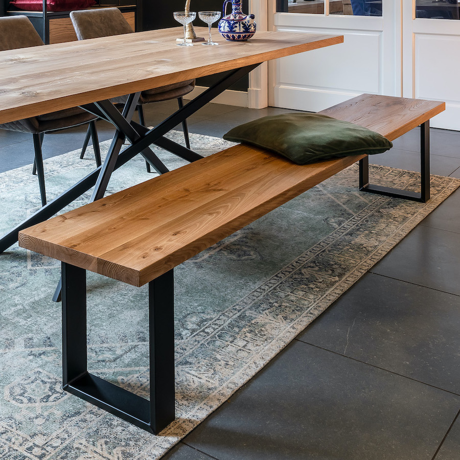 Eine Sitzbank aus Eiche passt genau zu deinem Esstisch aus massivem Eichenholz. Sowohl deinen Esstisch als auch deine Sitzbank aus Eiche massiv kannst du ganz nach deinen Vorstellungen konfigurieren. Mit einer Massivholzplatte aus 40 mm dicker Eiche und einem hochwertigen Stahlgestell sitzt du bequem und sicher. Damit deine Sitzbank fürs Esszimmer auch optimal zu deinem Esstisch aus Massivholz passt, kannst du neben der Kante und Größe auch die Farbe und das jeweilige Gestell auswählen. Damit wird deine Bank aus Eiche genauso ein Unikat wie deine anderen Möbel aus Massivholz.
